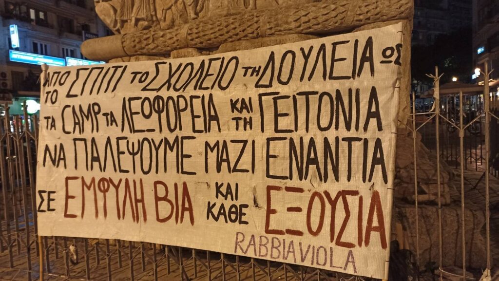 Σήμερα παρά τις άσχημες καιρικές συνθήκες βρεθήκαμε στο δρόμο για να σταθούμε ενάντια στην έμφυλη βία. Κατά τη διάρκεια της προσυγκέντρωσης στην Καμάρα, μοιράσαμε κείμενα και κρεμάσαμε περιμετρικά της Καμάρας χαρτόνια με συνθήματα ενάντια στην έμφυλη βία και την κακοποίηση των θυληκοτήτων.
