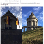 Nicht zuletzt deshalb wurde den Burschenschaften die Nutzung der Wartburg untersagt – was sie allerdings nicht davon abhielt, von ihrem offiziellen Festzelt am Burschenschaftsdenkmal loszuziehen und in einer unangemeldeten Kundgebung zumindest eine Ansprache im Burghof abzuhalten. [2] Die Rede hielt Michael Büge, der wegen seiner Mitgliedschaft in der extrem rechten Berliner Burschenschaft Gothia sein Amt als Staatssekretär verloren hatte. Ende 2016 ist Büge von der CDU in die AfD gewechselt. [3] Corinna Herold, AfD-Abgeordnete im Thüringer Landtag, verlas ein Grußwort. Darin teilte sie ihre „Verbundenheit zur Deutschen Burschenschaft und ihren Idealen“ mit. [4]