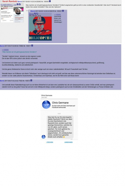 Der Fall Sarah Rambatz sorgte vor der Bundestagswahl für einiges Aufsehen. Eine Person leakte einen Screenshot aus einer geschlossenen Gruppe und verursachte neben dem Verlust vom Listenplatz zur Wahl für einen volksdeutschen Mob, der sich volkstümelnd in sexistischen, antisemitischen, sexuellen, Todes- und sonstigen Gewaltphantasien erging und die Sarah und Familie direkt bedrohten. Durch Recherche haben wir den Täter ausfindig gemacht. Es handelt sich dabei nicht um einen Neonazi oder einen irgendwie organisierten Rechten. Es handelt sich um das, was gemeinhin als „besorgter Bürger“ firmiert. Der eigentlich unauffällige Nachbar von nebenan, der einem einen Bausparvertrag schmackhaft machen möchte, ein Auto verkaufen oder eine Lebensversicherung. Um einen normalen Alltagsrassisten also, von denen es viel zu viele gibt und die das Leben in Deutschland so deutsch machen.