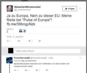 Der Mainzer AfD Politiker Sebastian Münzenmaier hat auf seiner Seite ein Video seiner Rede bei einer Veranstaltung von Pulse of Europe. Das Video betitelt er mit „Ja zu Europa, nein zu dieser EU“.