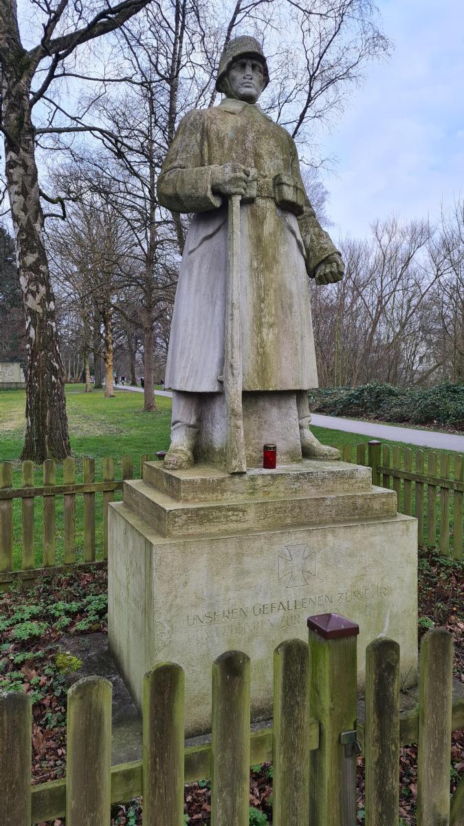 Auf Foto 6 in der Fotogalerie ist der Infanterist zu sehen. Dieser wurde ursprünglich 1934 an der Heiersburg aufgestellt und diente der Ehrung des Paderborner 158ten Regiments, das im ersten Weltkrieg auf Seiten des deutschen Kaiserreichs kämpfte. Insgesamt 3316 Regiments-Angehörige wurden im ersten Weltkrieg getötet. Zu ihren Ehren kämpften (nicht nur) die Überlebenden des Regiments für den Infanteristen als Denkmal. Der Infanterist stand auf einem würfelförmigen Sockel, in dessen vier Seiten verschiedene Inschriften eingefügt waren. Auf der Vorderseite ist ein eisernes Kreuz zu sehen, begleitet von der Aussage „Unseren Gefallen zu Ehren den Leben„. Auf den anderen drei Seiten war Folgendes zu lesen: „Wir Toten fordern als unser Recht die gleiche Treue vom lebenden Geschlecht„, „1897 R158 1918 | 3316 Kameraden starben 1914 – 1918 den Heldentod“, „1921 R18 1945 | Ihren im Weltkriege 1939 – 1945 Gefallenen Kameraden“ und ein weiteres eisernes Kreuz.  Die Geschichte des Ehrenmals begann, wie ausgeführt, bereits als Verherrlichung des Krieges, indem den Gefallenen für ihren „Heldentod“ gedankt wurde. Nach dem Zweiten Weltkrieg wurde die Inschrift jedoch erweitert, um auch hier Paderborner Wehrmachtsoldaten zu gedenken.