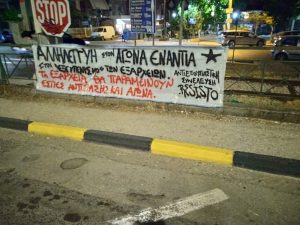 Τα Εξάρχεια,τις τελευταίες μέρες, αποτελούν ένα κατεχόμενο έδαφος από κάθε λογής δυνάμεις του κατασταλτικού μηχανισμού.Ο λόγος, η δημιουργία του νέου σταθμού μετρό στην πλατεία και η ανάπλαση, με όρους κερδοφορίας για το κεφάλαιο, του λόφου Στρέφη.Το κράτος έχει εξαπολύσει στην περιοχή μια επίθεση με τρομερή ένταση, αφενός για να κάμψει τις αντιστάσεις που διαχρονικά γεννιούνται σε αυτή και αφετέρου για να μεταμορφώσει τη γειτονιά σε ένα πεδίο κερδοφορίας για τα αφεντικά των real estate και των νέων μεγάλων επιχειρήσεων που αναμένεται να δημιουργηθούν, ώστε να εξυπηρετηθεί το πλάνο της “τουριστικοποίησης” των Εξαρχείων”.Εμείς στεκόμαστε αλληλέγγυες και αλληλέγγυοι στον αγώνα που δίνουν οι σύντροφοι/-ισσες και οι κάτοικοι της περιοχής, ώστε να παραμείνουν τα Εξάρχεια μια γειτονιά που θα χωράει όλους τους καταπιεσμένους, μια γειτονιά που δε θα χρειάζεται να φεύγουν οι κάτοικοι της λόγω των υψηλών ενοικίων,μια γειτονιά εχθρική προς τους φασίστες και προς κάθε ένστολο σκουπίδι, μια γειτονιά όσο γίνεται απελευθερωμένη από την άκρατη εμπορευματοποίηση και την καπιταλιστική κερδοφορία.