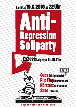Am Samstag, den 19.6. findet ab 22 Uhr im Exzess (Leipzigerstr. 91, Ffm) die Anti-Repressions-Soliparty des EA-Frankfurt und der Roten Hilfe Frankfurt statt.