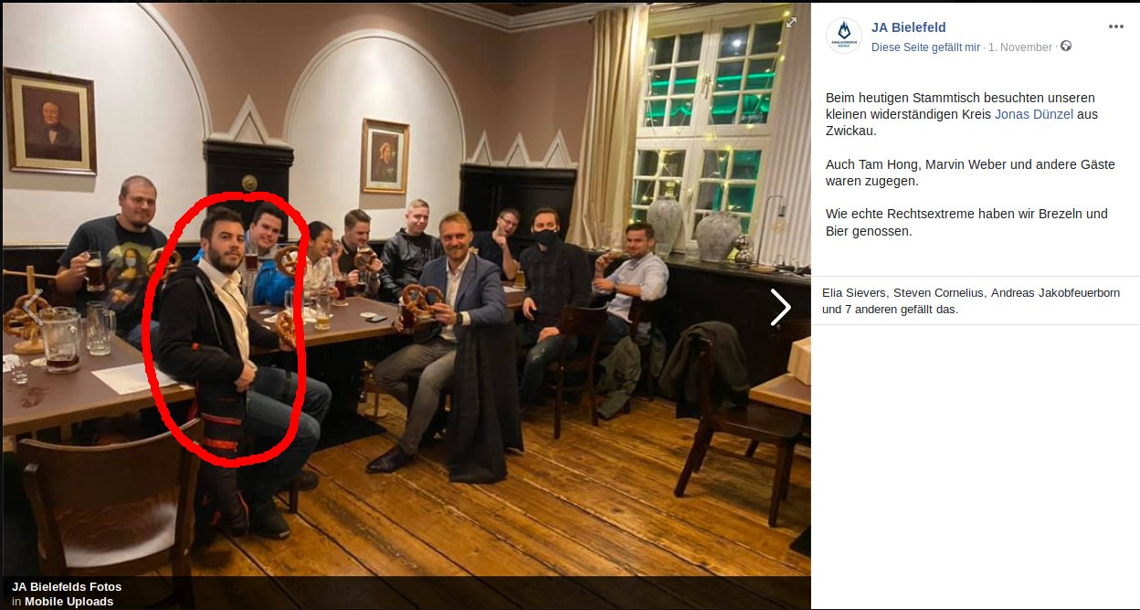 aufgrund seiner Mitgliedschaft in der verbotenen „Heimattreuen Deutschen Jugend“ wird Kalbitz weiter als Redner geladen, posiert für Fotos und trägt selbstverständlich auch die von Hannes Gnauck beworbene Maske der JA Brandenburg. Wie nun auch Jonas Vriesen in Bielefeld.