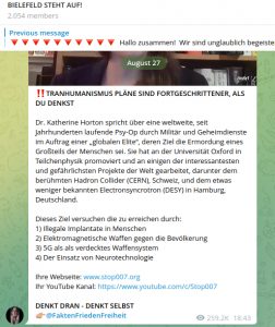 Wie wir schon in unserer ersten Stellungnahme zu „Bielefeld steht auf“ Anfang April 2021 klar dargelegt haben, dominieren in den Telegram-Chats strukturell bis offen antisemitische Verschwörungsmythen. So wird von der jüdischen Familie Rothschild schwadroniert, diese Familie sei verantwortlich für die Pandemie und verfolge damit den Zweck der Entvölkerung Deutschlands und der Welt (siehe Screenshots unten). Dies ist eine aktualisierte Variante offen antisemitischer Verschwörungsmythen über Vernichtungspläne einer fiktiven jüdischen geheimen Elite an dem deutschen Volk, wie sie auch im Nationalsozialismus vertreten wurden. Die hier aufgeführten Screenshots sind nur exemplarisch. Für jeden hier dargestellten Sachverhalt finden sich im Telegram-Chat von „Bielefeld steht auf“ vielfältige Beispiele. Immer wieder wird von „geheimen Eliten“ geschrieben, die die Dezimierung der Weltbevölkerung vorantreibe.