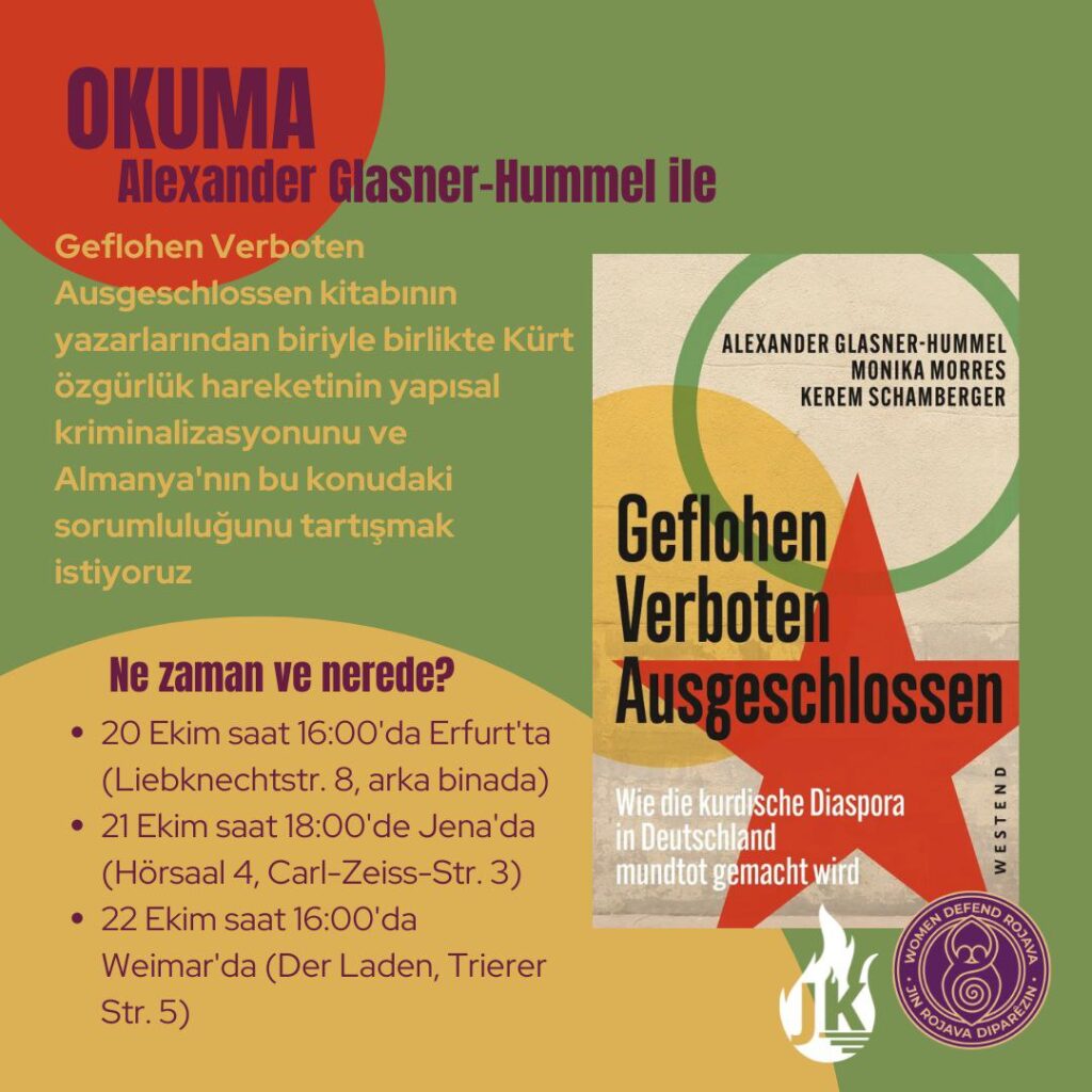 Wir haben einen Veranstaltungshinweis für euch: Die Genoss:innen von Women Defend Rojava laden euch herzlich zur Buchvorstellung von „Geflohen. Verboten. Ausgeschlossen. Wie die kurdische Diaspora in Deutschland mundtot gemacht wird“ in Erfurt, Jena und Weimar ein:
