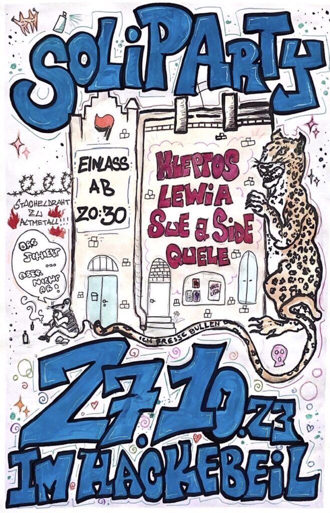 „Wir laden euch ein sich mit uns auf den Beat der Solidarität einzuschwingen. Am 27.10.2023 wollen wir mit euch im Hackebeil Erfurt feiern. Um 20:30 Uhr geht es los. Auf unserer Soliparty vereinen sich die Musikgeschmäcker vieler.