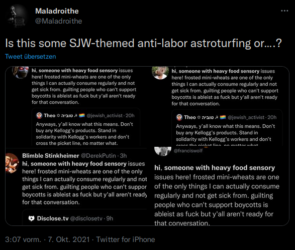 Am Mittwoch, dem 06. Oktober 2021, ruft ein Twitteraccount zu einem solidarischen Boykott mit den Streikenden Kellogg’s Angestellten auf. Wenige Stunden später gehen mehrere identische Tweets von verschiedenen Accounts viral, die den Druck zur Teilnahme an einem Boykott für ableistisch erklären, da Menschen mit sensorischen Verarbeitungsschwierigkeiten auf spezifische Nahrungsmittel, in diesem Fall Kellogg’s Frostys, angewiesen sein können. Es ist umstritten und für mich nicht mehr nachvollziehbar, ob diese identischen Tweets einen echten Ursprungstweet parodieren, oder als gezielte Desinformationskampagne gegen den Boykott gesetzt wurden (oder beides).