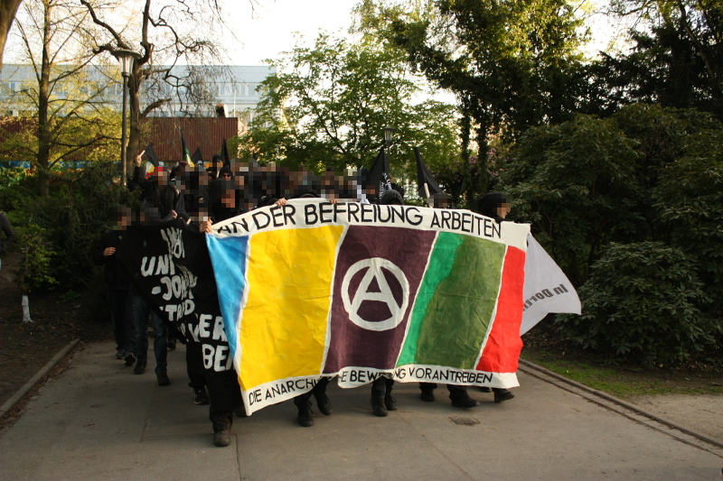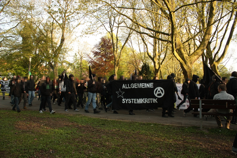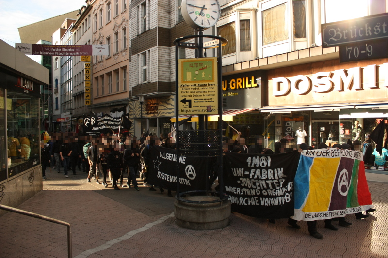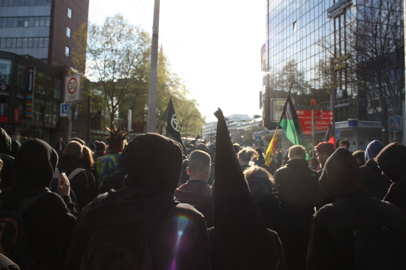 Seit langem formierte sich heute das erste Mal wieder eine Anarchistische 1. Mai Demonstration in Dortmund, welche mit 300 Menschen ein klarer Erfolg für die Bewegung im Ruhrgebiet darstellt. Der durchgehend laute und kämpferische Demonstrationszug bewegte sich von der Dortmunder Nordstadt durch die Innenstadt bis zum Westpark.