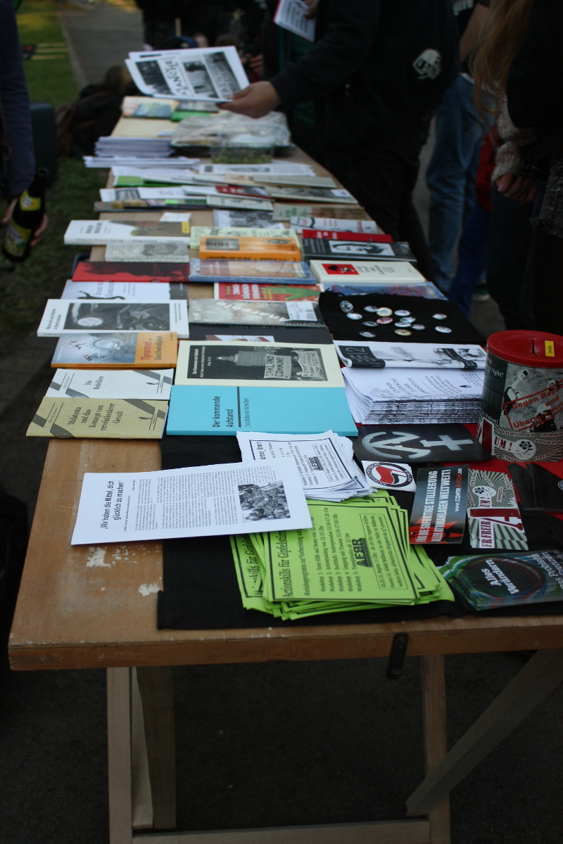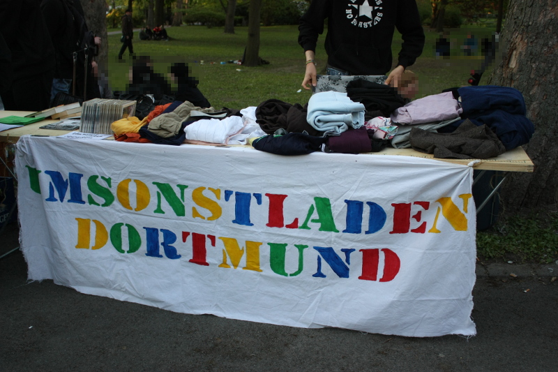 Nach einer entschlossenen Rede zum Auftakt setzte sich die Demo in Bewegung. Die durchweg lautstarken Parolen wurden durch das Lauti-Fahrrad welches sich am Ende der Demonstration bewegte, passend untermalt. Kurz vor Erreichen des Westparks versuchten die Bullen die angemeldete Route um circa 400 Meter zu verkürzen indem sie mit einem Bulli in den Demozug hinein fuhren. Dies ließen sich die Leute nicht gefallen und nach kurzen Verhandlungen konnte die ursprüngliche Route zu Ende geführt werden. Nach circa einer Stunde kam die Demo im Westpark an, der bereits durch das gute Wetter ziemlich belebt war. Nach kurzer Verzögerung wurde ein „Gib und nimm“ Tisch, ein Info/Büchertisch, sowie eine Küche für alle aufgebaut. Nebenbei gab es Musik und weitere Redebeiträge, unter anderem wurde die gemeinsame Erklärung politischer, kämpfender, widerständiger Gefangener zum 1. Mai 2015 verlesen. In den Redebeiträgen wurde dazu aufgerufen weitere selbstorganisierte Projekte auf zubauen und sich zu organisieren. Bis zum Einbruch der Dunkelheit war die Stimmung ausgelassen und fröhlich. Es wurde gegessen, getrunken, gesungen, gespielt und neue Kontakte geknüpft. Während der gesamten Veranstaltung hielten sich die Bullen zurück und waren zahlenmäßig speziell für Dortmunder Verhältnisse nur schwach vertreten.