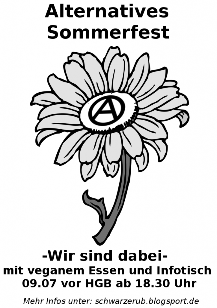 Einige Gruppen organisieren am 09.07 ein alternatives Sommerfest als „Ersatz“ für das ausfallende Campusfest dieses Semester. Die schwarze Ruhr-Uni ist auch dabei und wir werden veganes Chili gegen Spende anbieten. Außerdem gibt es einen Infotisch von uns.