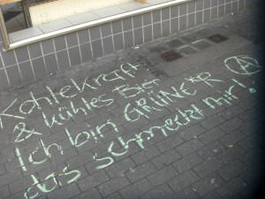 „Kohlekraft & kaltes Bier / Ich bin Grüne*r / das schmeckt mir (vor Kneipe gekreidet)“