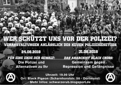 Danach werden Alternativen zur vermeintlichen Konfliktlösung durch die Polizei vorgestellt. Fokus ist dabei wie wir so mit Konflikten umgehen, dass sich unserer Leben konkret verbessert und gleichzeitig dem Staat ein Stück Kontrolle entziehen. Eine Inspiration ist Community Accountability (Gemeinschaftliche Verantwortlichkeit). Der Vortrag soll auch Anlaufstelle für Interessierte an neuen anarchistischen Community Accountability – Gruppe im Ruhrgebiet sein. Der Vortrag findet am 24.08. um 19.00 Uhr im Black Pigeon in Dortmund (Scharnhorstr. 50) statt