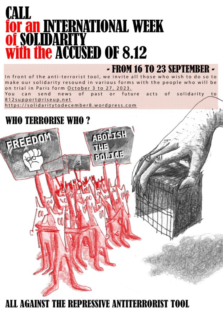 We invite you to echo in various forms our determination and rage against their world, and our solidarity with people who will go to trial in Paris from October 3 to 27, 2023.
