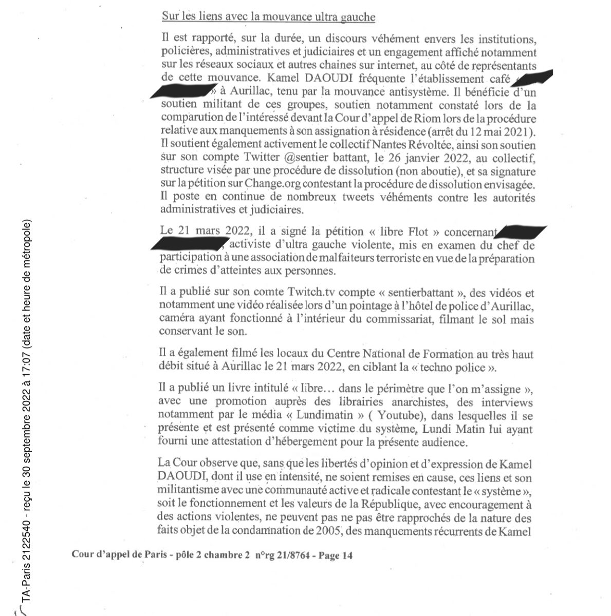 En juin 2022, la cour d’appel de Paris utilisait la situation de Libre Flot et la tentative gouvernementale de dissolution de Nantes Révoltée pour perpétuer l’acharnement administratif contre Kamel Daoudi, assigné à résidence depuis… 14 ANS!