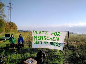 Stadtverwaltung und Polizei rückten am heutigen Morgen an und räumten die kleine Spontanversammlung nach kurzer Zeit gewaltsam weg. Seitdem wird das Gelände, welches – wie geschildert – immer noch formal von einem Landwirt gepachtet wird, von der Polizei bewacht. Kritik an VW wird mit Staatsgewalt verdrängt. Die Verkehrswende-Aktiven harren zurzeit auf einer Ersatzfläche aus, die allerdings nur an einer Autostraße liegt, also von Fußgänger*innen kaum erreichbar ist. Sie warten dort auf die Gerichtsentscheidung.