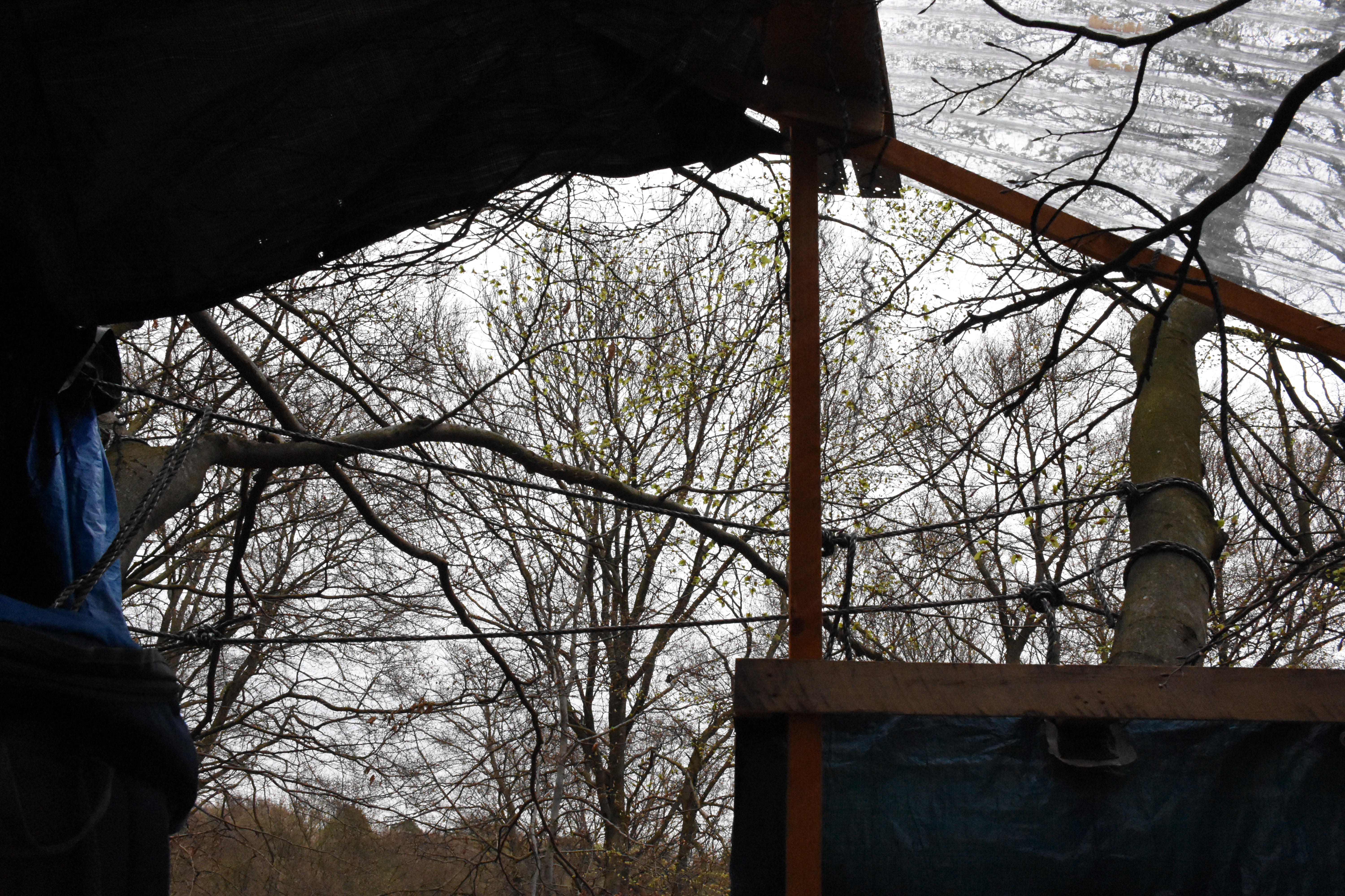 Sichtlich angefressen verneint der Einsatzleiter mein Angebot den Wald zu verlassen, und bittet mich, die neue Route mit ihm zu begehen. Nach einigen Metern bleibe ich stehen, deute auf eine Fläche von etwa 20×20 Metern, die von der Hebebühne befahren werden könnte, um das Camp zu erreichen, und die zu beiden Seiten von im Boden angeketteten Aktivisti begrenzt wird.