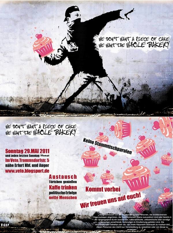 wir wollen euch und eure Freund_innen für den 14. August ins Veto zum Törtchencafé einladen. Für alle, die sich wundern, ja, es ist nicht der letzte Sonntag im Monat, doch der einzige Sonntag, an dem nicht alle Bäcker_innen im Urlaub sind 😉 Wir wollen 14Uhr beginnen und so bis 17Uhr bleiben.