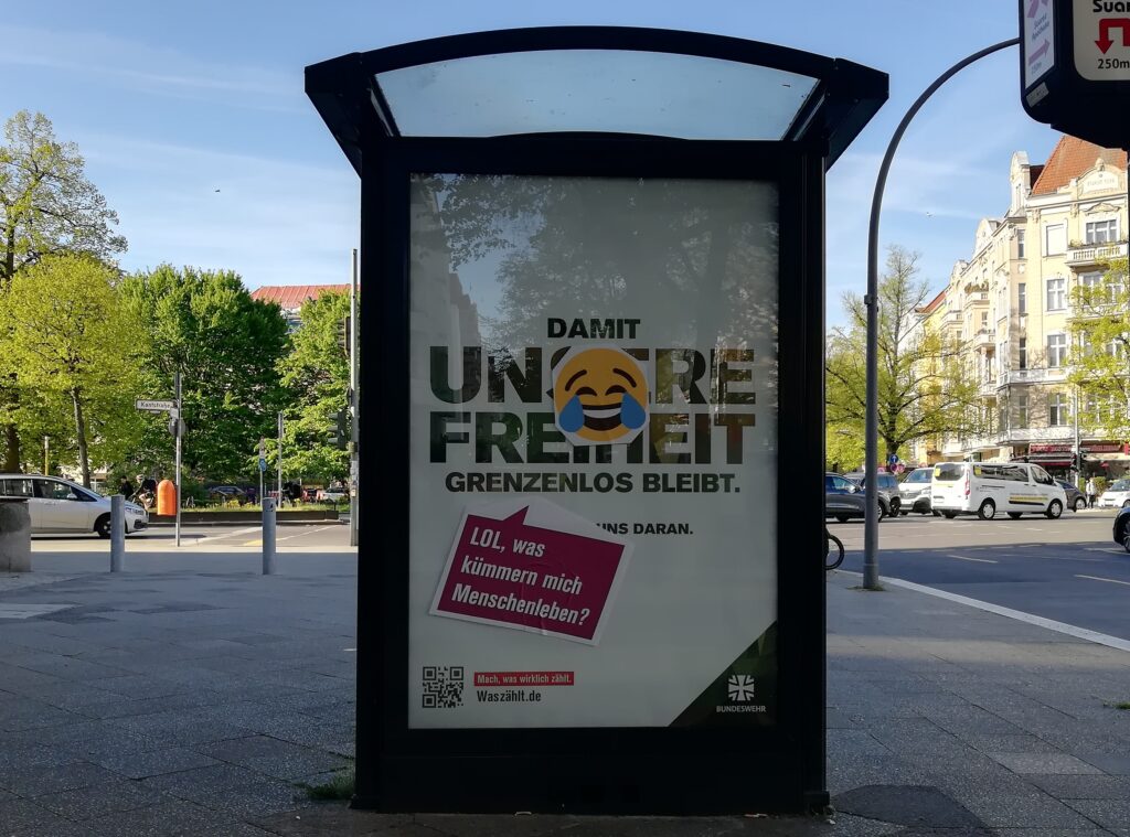 Kaum macht die Bundeswehr nach langer Pause wieder Werbung in Berlin, wird sie auch schon in der Öffentlichkeit kritisiert. In Charlottenburg, Neukölln, Schöneberg und Treptow tauchten auf den Werbepostern des Militärs unautorisierte Aufkleber auf. So kommentierten Unbekannte die Slogans mit Kacke- und Kotz-Smileys sowie Sprechblasen mit Kritik am Militär. Die Aufkleber stammen von der Kampagne „Werbung abrüsten!“ Deren Sprecher*in Yver Cleber sagt: „So werden die Millionen im Propaganda-Etat der Bundeswehr dank Aufklebern für ein paar Euro zum Bumerang!“