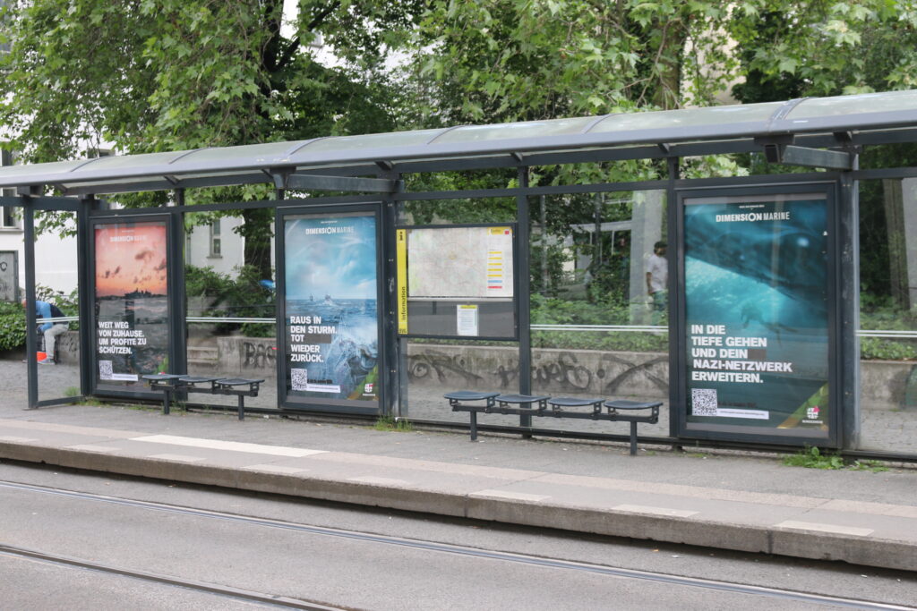 Ein Plakat zeigt den Bug eines Kriegschiffes mitsamt martialischer Maschinenkanone. „Raus in den Sturm. Gestärkt wieder zurück“ lautet der Slogan dazu. Die Aktivist*innen machten mit einer kleinen Veränderung daraus den Slogan: „Raus in den Sturm. Tot wieder zurück.“