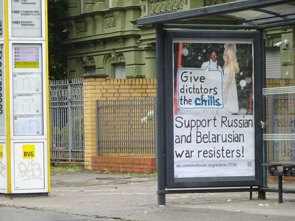 Über Indymedia sind wir darauf aufmerksam geworden, dass in Berlin umgebastelte Werbeplakate hängen, die Asyl für Kriegsdienstverweiger*innen aus Russland, Belarus und der Ukraine fordern. Da Indymedia immer mal wieder down ist und wir die Aktion sehr schön finden, spiegeln wir das ganze einmal hier. Es folgt der Text der Aktionsgruppe „Asyl für Kriegsdienstverweiger*innen jetzt!“ (AfKj!).