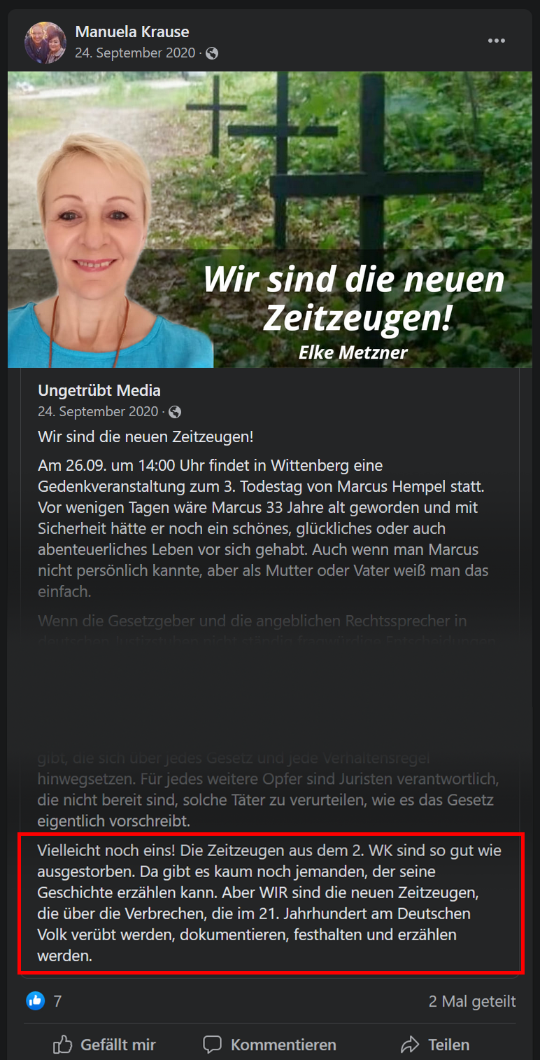Krause mit der billigen Antwort davon kommen zu lassen, Höcke und die AfD hätten mit der OB-Wahl nichts zu tun, ist schwach. Krause ist keine Lokalpolitikerin, die mit dem Rest der Partei nicht so viel zu tun hat und sich nur ein wenig Gehör verschaffen will. Es ist bekannt, dass vor allem der AfD Kreisverband Saalekreis fester Bestandteil des extrem rechten „Flügels“ war. Dieser hatte sich formal aufgelöst, um einer Beobachtung des Verfassungsschutzes zu entgehen. Krauses biblische Faszination für den Flügel ist auf ihrer Facebook-Seite immer noch zu sehen. Dass sie nicht nur Bewunderin des Flügels war, sondern sich auch als Teil dessen fühlte, zeigt ihre Teilnahme am Flügeltreffen in Schnellroda am 06.03.2020.