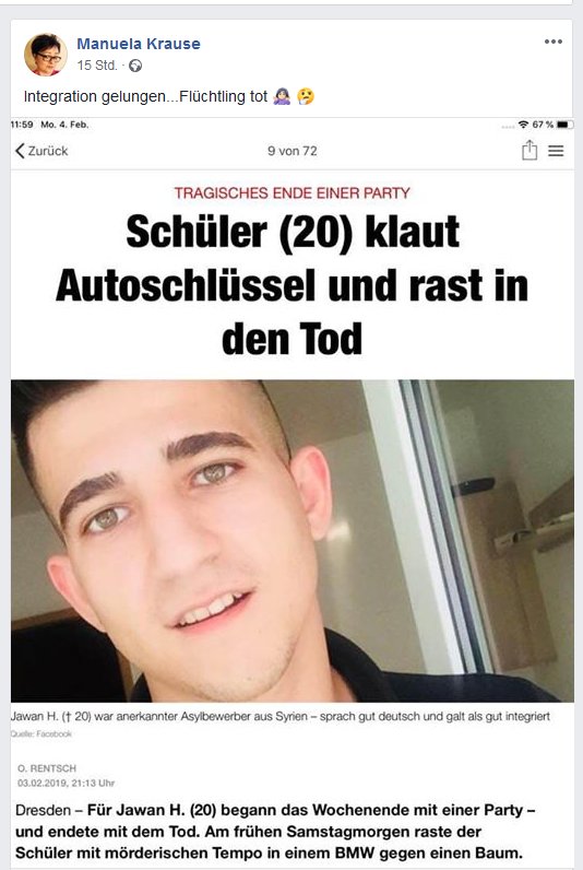 Dem lässt sich nicht mehr viel hinzufügen. Mordfantasien gegenüber Asylbewerber*innen, Lachen über den Tod eines Asylbewerbers, kein Problem mit „SSMANN“ und NS-Runen. Hinzu kommen noch Shoah-Verharmlosung und ein wohl vergessener Like bei der Facebook-Seite des Neonazis Sven Liebich.